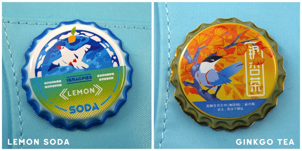 32mm bottlecap buttons. A safety pin is affixed to the back! Please check the individual images for the variants.
